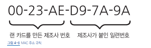 MAC 주소는 48비트 숫자로 구성되어있고 그 중 앞쪽 24비트는 랜카드를 만드는 제조사 번호 뒤쪽 24비트는 제조사가 랜 카드에 붙인 일련번호이다.