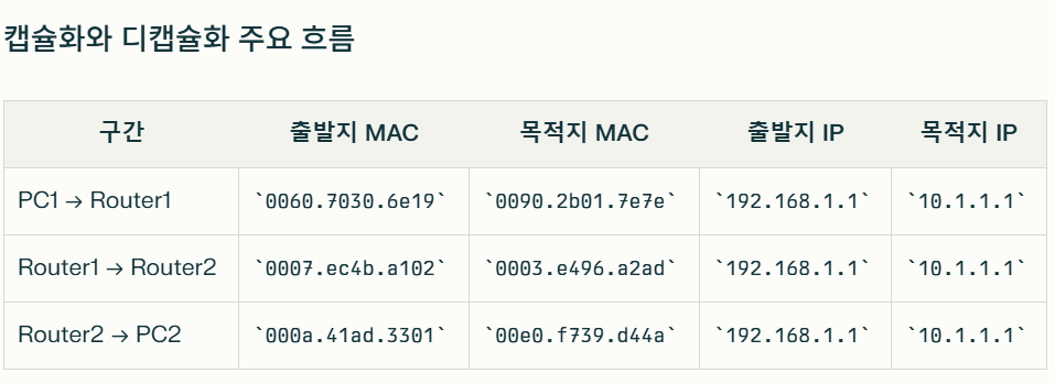 - 각 구간마다 캡슐화 및 디캡슐화를 반복하며, 최종적으로 데이터를 목적지(G)에서 완전히 복원합니다.
